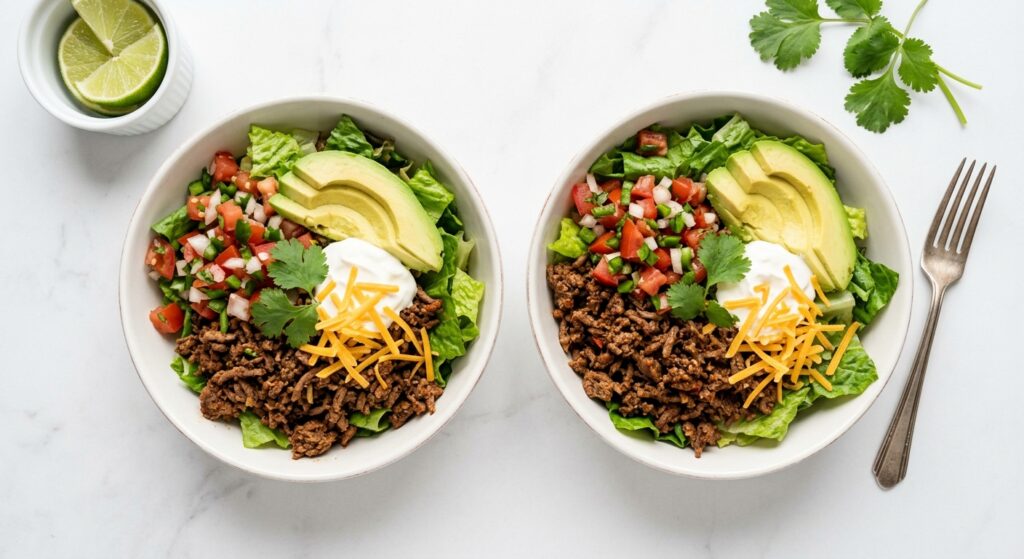 All the flavors of tacos in a bowl! Seasoned ground beef with fresh toppings—no shell needed.