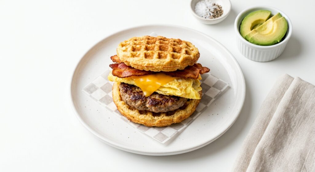 A satisfying breakfast sandwich using cloud bread or cheese rounds instead of traditional bread.